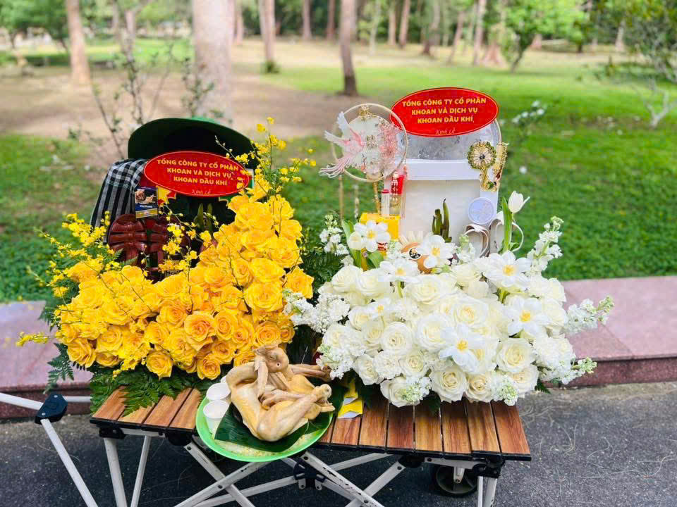 Hoa tươi: ưu tiên hoa trắng như cúc trắng, huệ trắng hoặc hồng trắng.