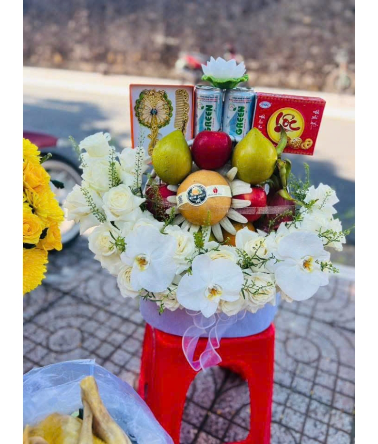 • Mâm ngũ quả theo mùa: Táo, cam, xoài, thanh long, và lê-ki-ma.