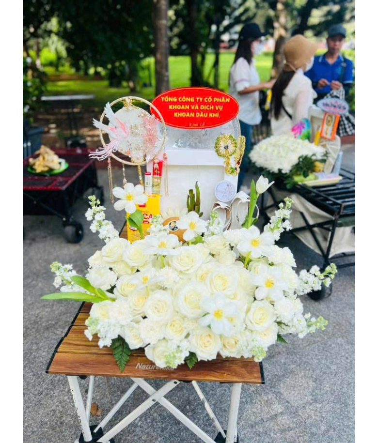• Lẵng hoa đẹp theo mùa (kết hợp các loại hoa sau: hoa cúc trắng, mẫu đơn trắng, hoa sen trắng, hoa hồng trắng, hoa lan trắng, hoa tulip trắng, …